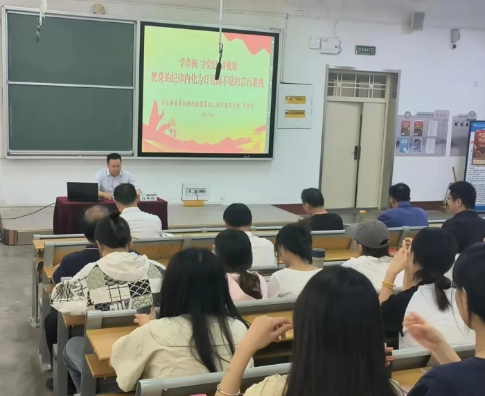 会议分为两个阶段,第一阶段组织全体师生党员观看警示教育片---《扣好廉洁从政的“第一粒扣子”》、《家声》。第二阶段由肖林峻处长作题为《学条例 守党纪 讲规矩 把党的纪律内化为日用而不觉的言行准绳》的党纪学习教育宣讲报告。《中国共产党纪律处分条例》(以下简称《条例》)坚持以习近平新时代中国特色社会主义思想为引领,全面贯彻落实党的二十大精神,深刻把握“两个确立”的重大意义,坚决做到“两个维护”,旨在进一步严明党的政治纪律和政治规矩,推动党的各项纪律全面从严,不断提升党的自我净化、自我完善、自我革新、自我提高能力,确保党始终成为中国特色社会主义事业的坚强领导核心。肖林峻处长从三个部分对《条例》进行了深入解读。第一, 深刻领悟《条例》重大意义,提高政治站位,用党规党纪校正思想行动;第二,精准把握《条例》主旨要义,牢记六大纪律,真正将其作为言行准则;第三,从严落实《条例》具体要求,自觉律己正身,永葆清正廉洁政治本色。报告内容丰富,生动详实,既让我们对党的纪律建设有了更深刻的认识和理解,又通过具体案例让我们受警醒、明底线、知敬畏。