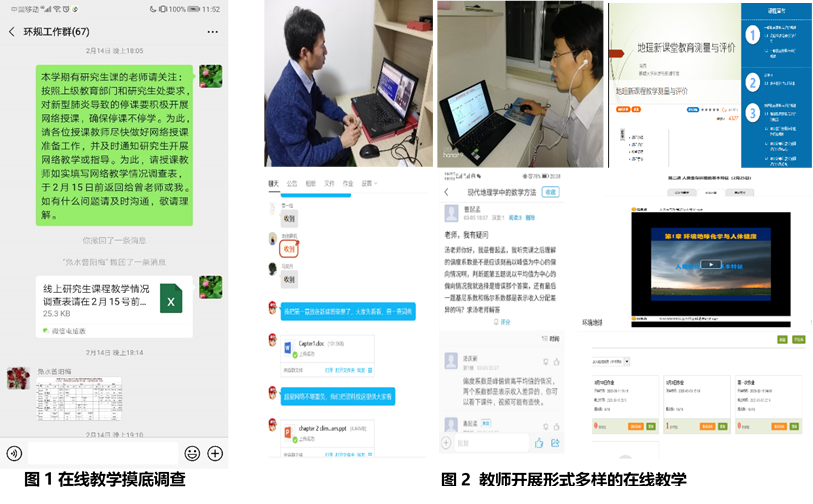 2月14日,学院在工作群里就本学期开展研究生课程在线教学的困难以及拟采用的网络教学平台进行了摸底调查(图1),帮助教师解决在线教学中遇到的困难。2月17日,所有本学期开设的研究生课程(除两门教学实践类课程外)均借助中国大学MOOC、超星泛雅、QQ学习群、Weichat学习群等平台正常开课。截止3月11日,所有课程在线教学均进展顺利。授课教师根据课程自身特点,采用了课前作业、学生自学、录课上传、课堂弹幕、课堂测试、分组讨论、课后作业、课下互动答疑、课后测验等形式多样的教学手段,调动了学生在线学习的积极性和主动性。教师准时上课,学生认真停课,师生积极互动,教学效果良好。