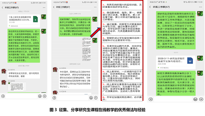 通过在线教学培训和交流讨论,教师对在线教学逐渐由不熟悉到熟悉,同时也积累了一些做法和经验。为此,通过学院微信群和QQ群征集研究生课程在线教学过程中好的做法和成功经验,经汇总提炼后发送到学院工作群与大家分享(图3),激发了网络教学的兴趣和热情。