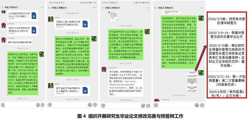 虽然疫情仍在持续,但这丝毫没有影响学院研究生毕业论文预答辩和论文修改完善进度。考虑到由于网速慢和客户端电脑配置低可能造成网络视频预答辩卡顿而影响预答辩效果,经学院研究决定,采取“总-分-总-分-总”五步走模式进行今年的研究生论文预答辩。第一个“总”是学院规定研究生在2月29日前提交毕业论文,学院对毕业论文完成情况进行汇总,掌握学位论文的总体进度,明确存在的具体问题,以便进行督促和调整方案。截止目前,有4名研究生申请延期,其他研究生均以提交论文。第一个“分”是遴选预答辩评委,按照论文内容和评委研究方向相近原则进行分配,打包发给评委,并电话通知各评委,在3月5日前完成评阅工作。第二个“总”是评委将评阅意见返回到学院,学院将每篇论文的所有评阅意见进行汇总整理,3月6日前完成。第二个“分”是将每篇论文的评阅意见及对应的评委信息一并发给导师和研究生本人,方便有疑问或意见不一致时及时交流;同时,学生根据评阅意见填写论文预答辩登记表,预计在3月20日左右完成。第三个“总”是学院收齐完善后的毕业论文,进行汇总,填写论文预答辩汇总表,预计3月底前完成并上交研究生处。期间,各位研究生导师通过微信、QQ、电话、邮件等多种方式指导修改毕业论文,督促研究生查阅文献资料,按时完成毕业论文,确保疫情期间科学研究与学位论文不受影响。
