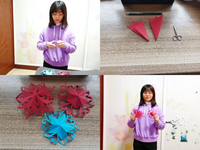 剪纸艺术是古老的中国民间艺术,作为一种镂空艺术,它能给人以视觉上透空的感觉和艺术享受。志愿者提前了解剪纸的基本知识,收集优秀的剪纸作品和相关资料,欣赏并学习剪纸艺术的制作流程。在掌握了“折、画、剪”的基本技巧后,志愿者便开始了艺术创作,智慧流转于指间,经典跳跃于指端,起稿,剪刻,揭离,惟妙惟肖的窗花便出现在志愿者的手中。制作完成后,志愿者将作品展示给身边的朋友和家人,向大家讲述自己作品的内涵,以及向大家普及剪纸艺术的历史和发展历程,着重叙述了剪纸在红色革命时期的重要性。随后,志愿者同家人一起将窗花张贴在家中,为家中增添了一道靓丽的风景。