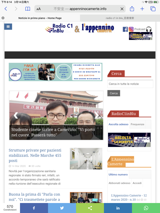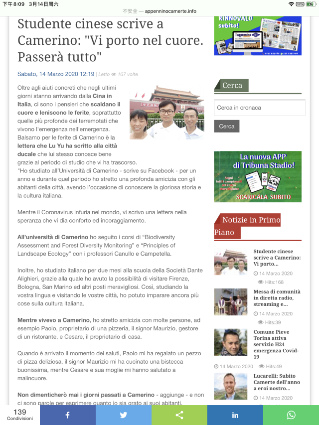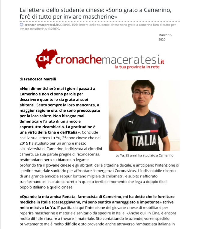 近日,中国新闻网一则题为“写信声援意大利走红的中国小伙:传递中国战疫经验”的新闻,报道了广州大学青年学子陆宇通过《致卡梅里诺人民的一封信》,产生强烈反响。陆宇同学为我校校友、环境与规划学院人文地理与城乡规划专业2013级本科学生,2015年公派前往意大利卡梅里诺大学留学,并与意大利人民建立起了的跨越国界的深厚友谊。