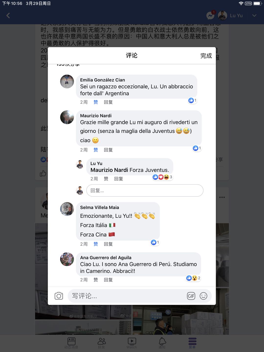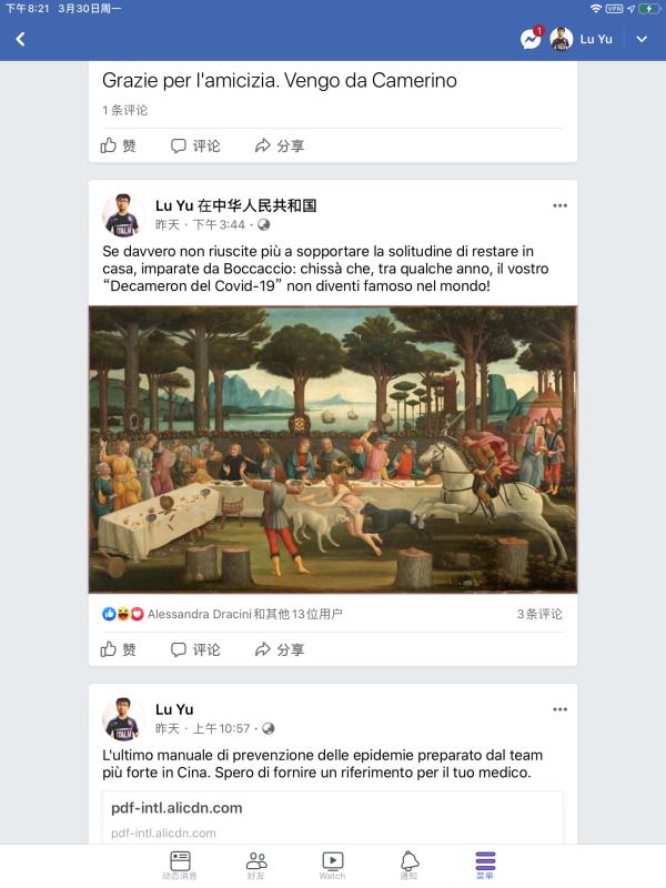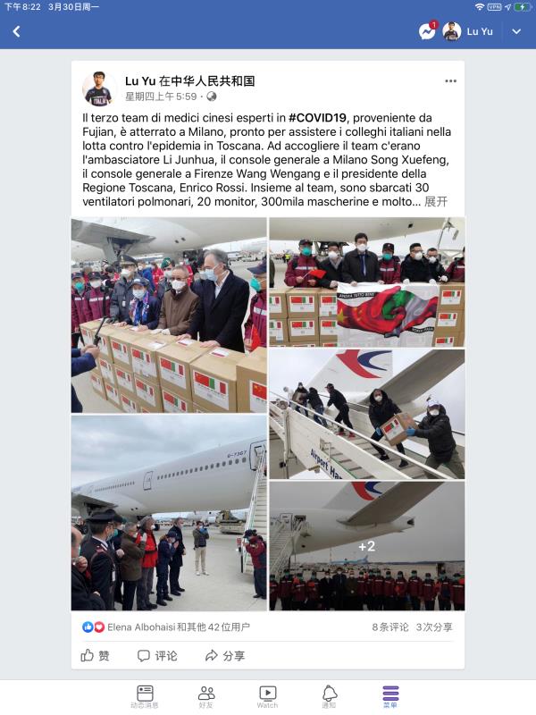 目前,陆宇并没有沉寂,而是利用自身影响力,进一步加强与意大利民众的交流。他每天在Facebook(国外社交媒体)上用意大利文转发中国援助意大利以及其他国家物资的消息,收集中国抗“疫”知识。这样做的所有目的都是为了更好地做支援工作。