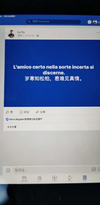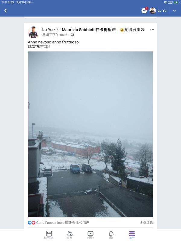 “当地人对我有恩,我在当地求学时对我比较关照。”陆宇在意大利认识了许多朋友,并建立了深厚的友谊。“意大利的朋友给我发当地下雪的照片,我立即转发至Facebook并配文‘瑞雪兆丰年’的中国俗语,一方面传递中华文化,另一方面鼓励疫情中的意大利。”