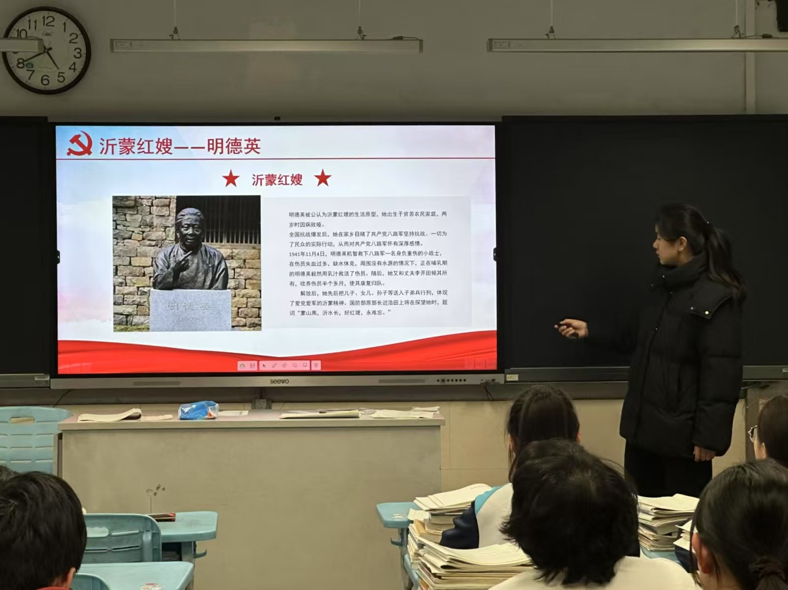 宣讲过程中,成员们着重分享了“沂蒙红嫂”明德英用乳汁救活八路军战士,以及“沂蒙六姐妹”在孟良崮战役期间碾米磨面、送弹药、救伤员的感人事迹。这些故事生动展现了沂蒙人民在革命战争中的无私奉献与英勇无畏,深刻诠释了沂蒙精神的内涵,同学们纷纷表示,要传承和弘扬沂蒙精神,将其融入到学习和生活中,为新时代的发展贡献力量。