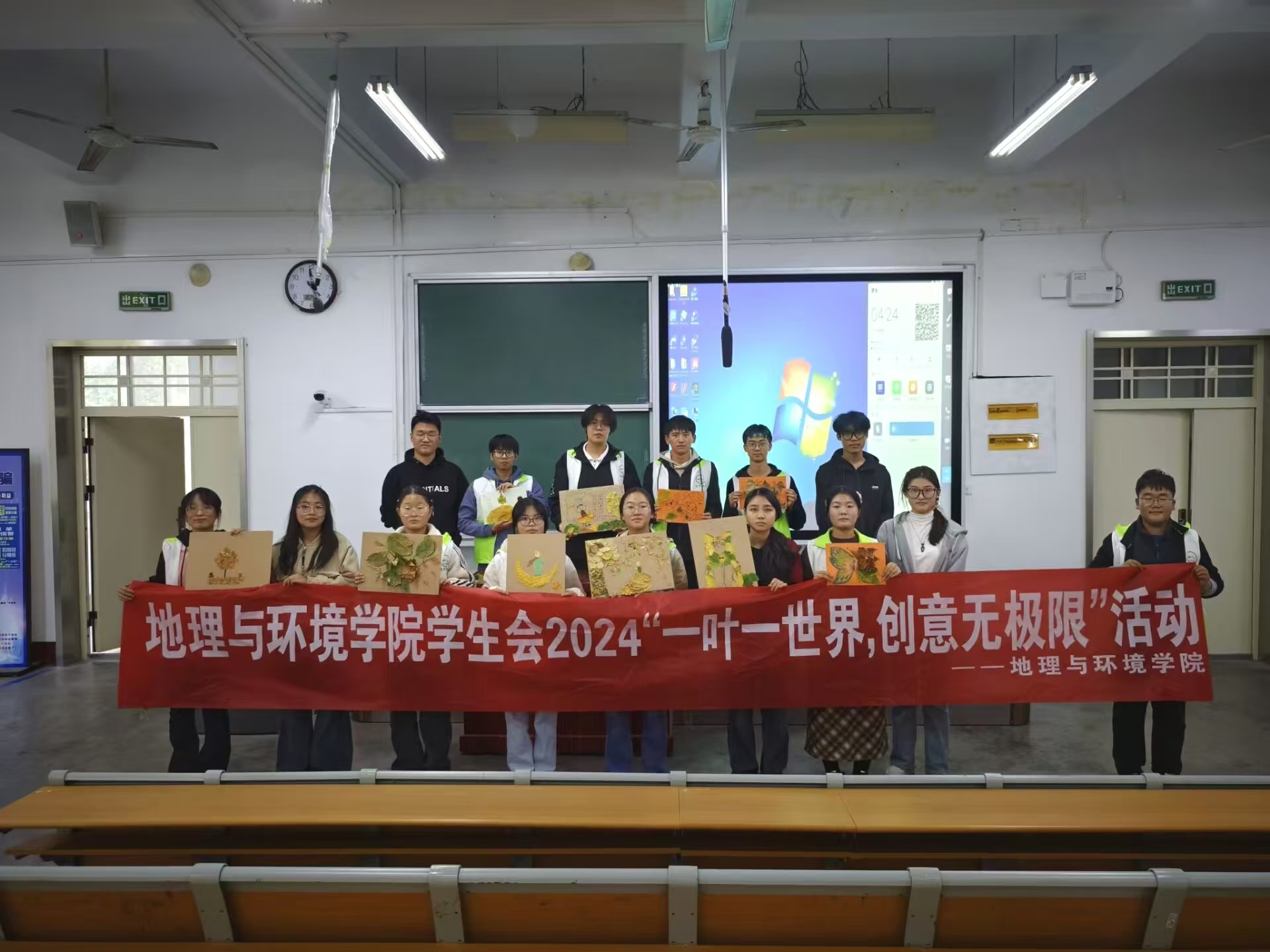 落叶承载岁月,落叶蕴含哲理。在制作结束后,同学们将自己的作品带到讲台前方,并对作品进行了简短的介绍,讲述了落叶画创作的灵感来源和基本立意,不仅体现了同学们对于环境保护的赤诚之心,更表达了他们对于未来环境状况的关切和美好愿望。