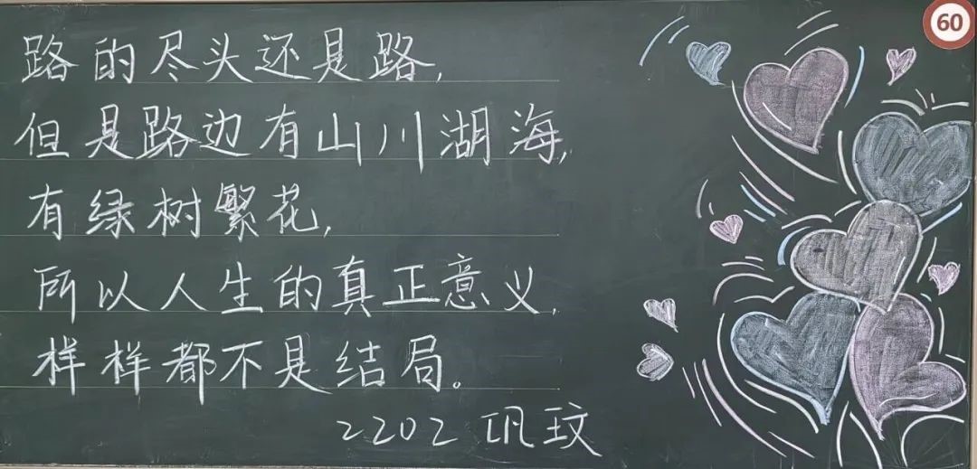 精彩纷呈的板书展现了同学们对传统文化的热爱和尊重,启发同学们对生活、自然和人生哲理的深层思考,展现了学院的活力与魅力,传递了学院的精神风貌,营造了积极向上的校园文化氛围。让我们携手努力,共同为打造更加丰富多彩的校园文化贡献力量!