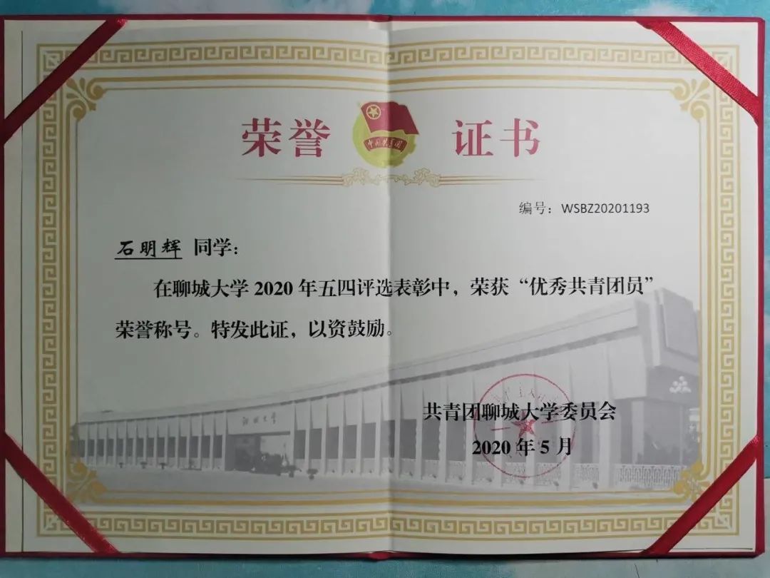 在球王会体育2020年五四评选表彰中,获得“优秀共青团员”荣誉称号;