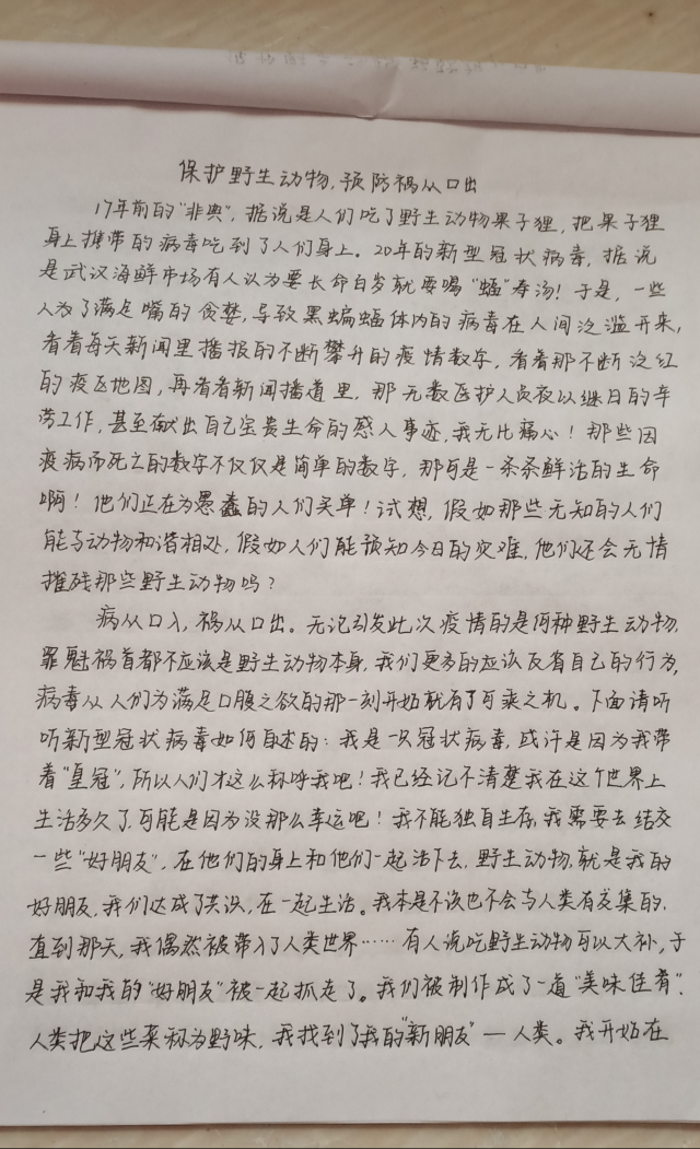 同一片天空,同一个家园。此次写作大赛以“人与野生动物的关系”为主题,手写与电子版形式共存等形式吸引了众多环规学子参与。同学们积极向主办方询问相关问题进行自主创作,提前将手写照片及电子版作品发于负责人。参赛作品虽然表达形式与创作方式各不相同,但都体现着“保护野生动物 人与自然共存”的理念。其中,何敬敏同学联系“非典”与“新冠”、以新冠病毒自述的独特口吻并结合自身感悟向人们揭示了病毒的传播途径,生动形象地体现了禁食野生动物的倡议,获得了优异成绩。