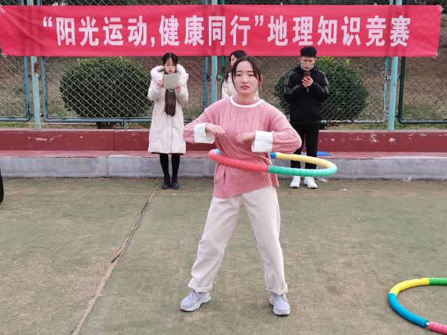 比赛通过分钟计时、边转呼啦圈边回答相关地理问题的形式进行。第一轮比赛以三分钟为基准,每五人一为组进行比拼,选手们蓄势待发、斗志昂扬、思维敏捷,凭借丰富的知识储备赢得了在场观众的阵阵掌声。经过第一轮选拔,在规定时间内呼啦圈不落地且答对题目多者晋级第二轮比赛。在第二轮比赛中题目难度激增,设题范围广而深,其中包括我国名胜地理位置、地貌气候,此外,世界之最、地理趣闻、古诗文中蕴含的地理知识也作为出题的重点,题目新颖、竞争激烈,现场气氛达到高潮。经过两轮激烈角逐,张哲凭借其腰、膝关节的灵活性和柔韧性以及扎实的地理知识储备脱颖而出,成功获得比赛冠军。
