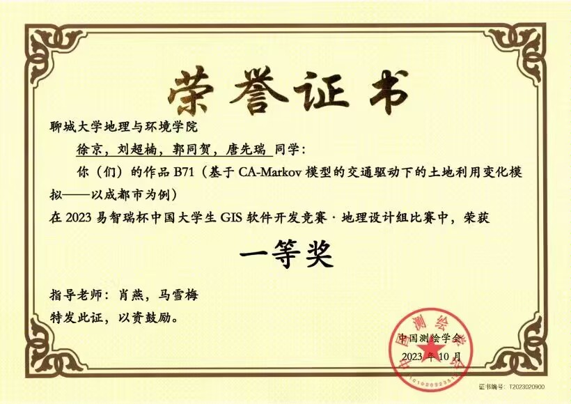 热烈祝贺球王会体育徐京、刘超楠、郭同贺、唐先瑞同学获得2023Esri杯大学生GIS软件开发竞赛地理设计组一等奖。此奖项的获得充分体现了徐京、刘超楠、郭同贺、唐先瑞同学的勤奋努力、艰苦奋斗,同时也为我校争得了荣誉。在此,向徐京、刘超楠、郭同贺、唐先瑞同学表示真挚的祝贺。