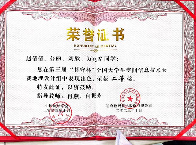 热烈祝贺球王会体育公丽、刘欣、赵倩倩、万兆雪同学获得第三届“苍穹杯”全国大学生空间信息技术大赛分析组二等奖。此奖项的获得充分体现了公丽、刘欣、赵倩倩、万兆雪同学的勤奋努力、艰苦奋斗,同时也为我校争得了荣誉。在此,向公丽、刘欣、赵倩倩、万兆雪同学表示真挚的祝贺。