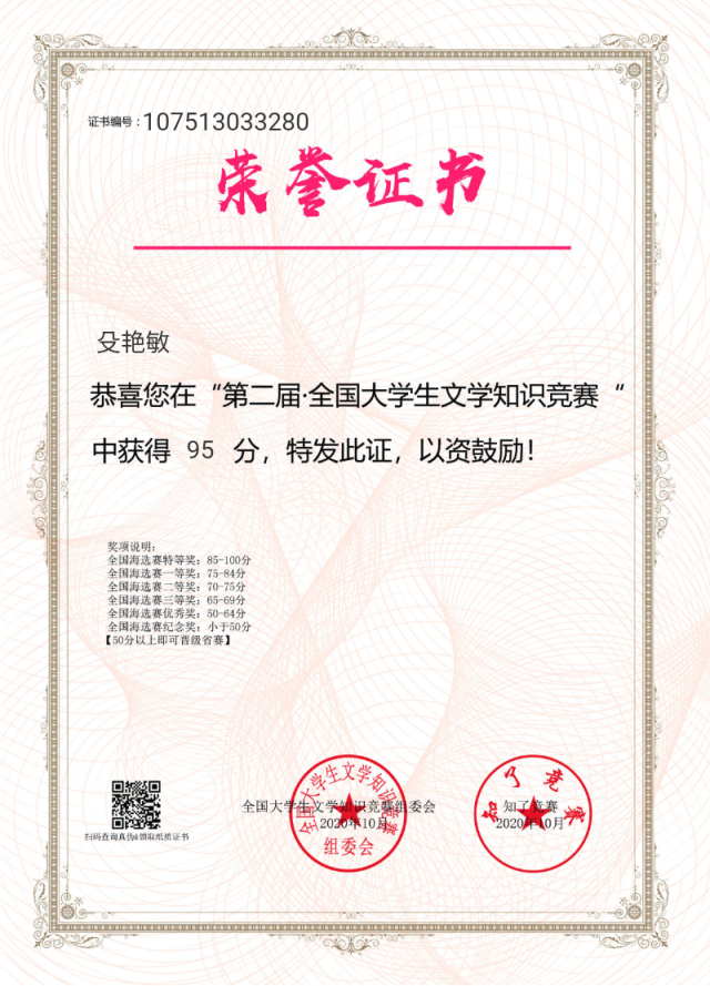 为传承中华文化,陶冶文学情操,2020年10月,环境与规划学院学生殳艳梅参加了第二届•全国大学生文学知识竞赛,获得了全国海选赛特等奖,使其提高了文学素养,增强了对文学的热爱之情。