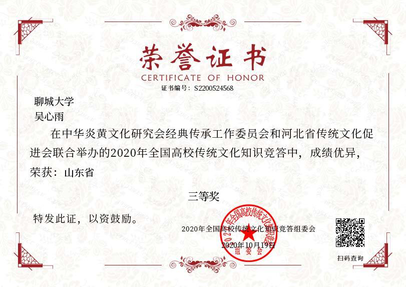 吴心雨在2020年全国高校传统文化知识竞赛中获得三等奖