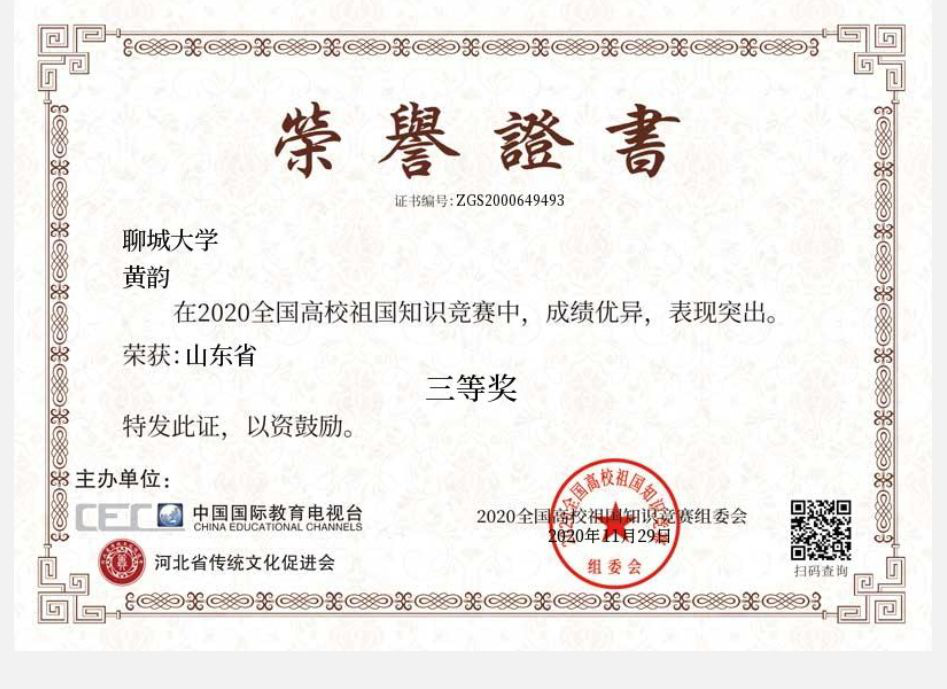 为增强祖国荣誉感和为祖国建设竭尽全力的责任感,2020年11月29日,环境与规划学院学生黄韵参加了2020年全国高校祖国知识竞赛,获得了三等奖,有助于其更深入更全面地了解祖国,增强热爱祖国的真挚情感。