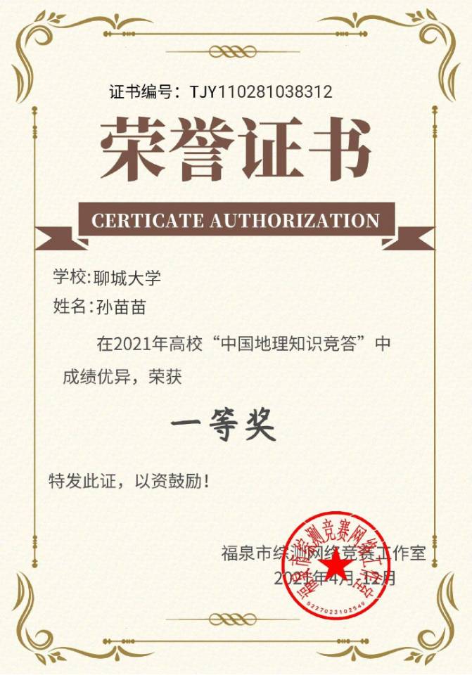 为更好的掌握专业知识,完善地理教学知识体系,2021年4月至12月,球王会体育孙苗苗参加2021年高校“中国地理知识竞答”,获得一等奖。