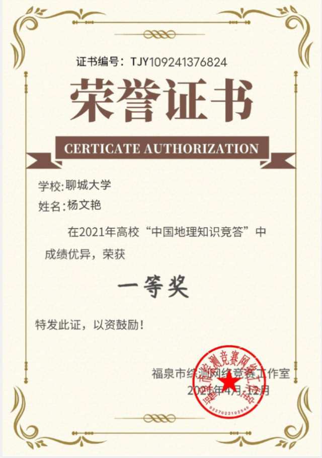 杨文艳在2021年高校“中国地理知识竞答”中获得一等奖