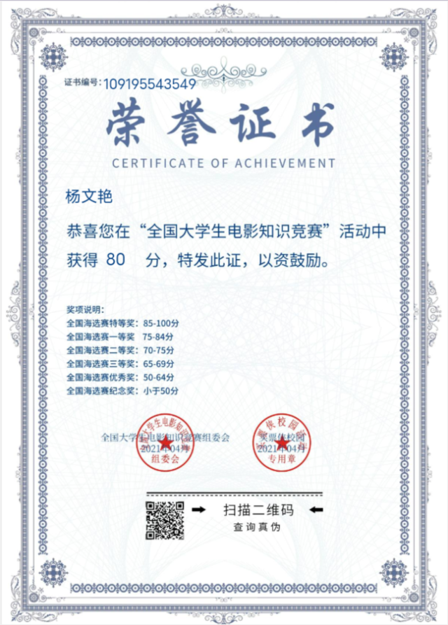 2021年4月,球王会体育杨文艳参加“全国大学生电影知识竞赛”活动,获得一等奖,充分彰显了大学生风采。