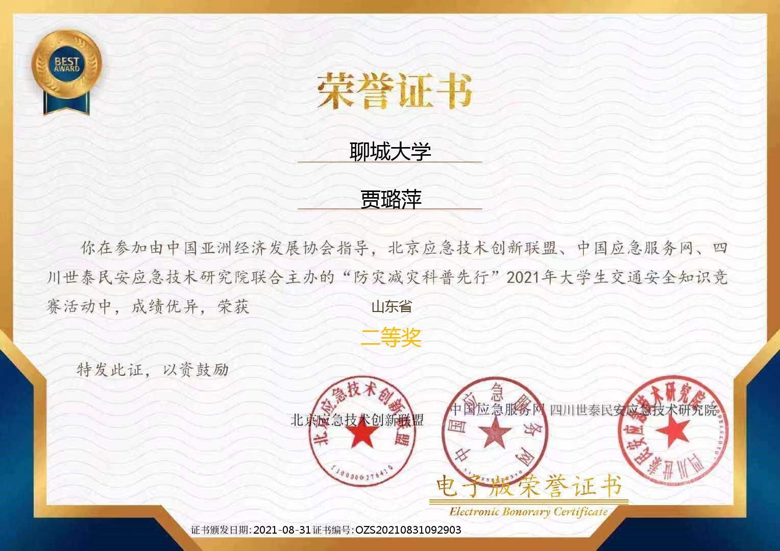 2021年8月31日,球王会体育贾璐萍参加了“防灾减灾科普先行”2021年大学生交通安全知识竞赛,获得二等奖。