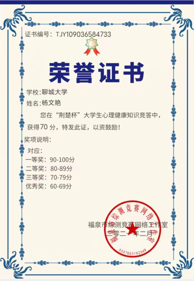 杨文艳在“荆楚杯”大学生心理健康知识竞答中获得三等奖
