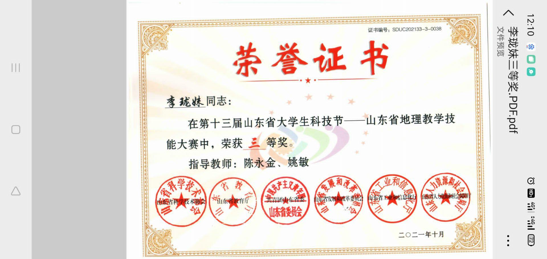 李珑妹在第十三届山东省大学生科技节——山东省地理教学技能大赛中获得三等奖。