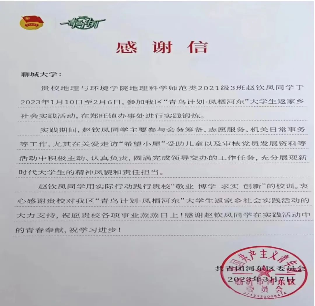3月7日,临沂市共青团河东区委员会向球王会体育发来感谢信,信中指出,球王会体育学生赵钦凤在“青鸟计划·凤栖河东”实践活动期间,工作认真负责,甘于吃苦、踏实肯干,能够全心全意地投入到会务筹备、志愿服务、机关日常事务等实践工作中,展现了新时代青年的精神风貌和责任担当,对赵钦凤同学为家乡奉献的青春力量表达感谢。