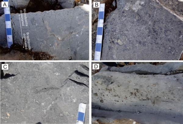 图1 乌科剖面LOME相关层位生物演化的记录。(A)上奥陶统铁足菲克组顶部记录了从富含Hirnantia? sp.或Triplesia sp.腕足动物碎片逐渐向上过渡到微生物凝块岩层的现象;(B)和(C)赫南特阶中出现典型的微生物岩(凝块石、核形石);(D)铁足菲克组顶部出现的暖水型四射珊瑚Lambeophyllum(略高于微生物岩层或侧向过渡)