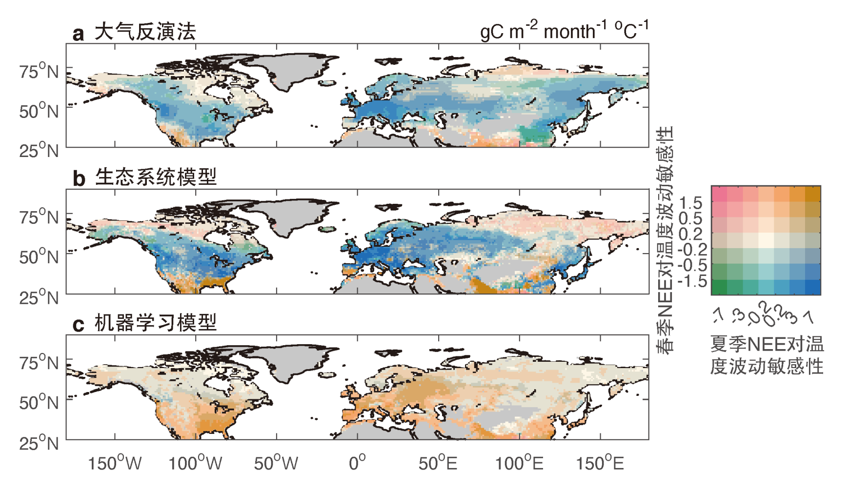 图1. 北半球陆地净生态系统碳交换量(NEE)对春、夏季温度变化响应的空间分布。正值表示升温抑制陆地碳汇,负值表示升温促进陆地碳汇