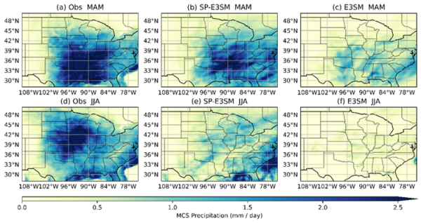 美国中部地区的春季和夏季观测到的MCS降水(a和d),SP-E3SM模拟的MCS降水(b和e),E3SM模拟的MCS降水(c和f)