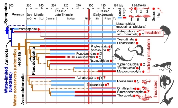 部分非鸟类兽脚类恐龙的分支和两个基干类食草性的鸟臀目恐龙都有羽毛。根据系统发育支架法,研究推断恐龙天生具有羽毛,但这些羽毛明显不是用于飞翔。此外,恐龙的羽毛结构和翼龙的羽毛结构相似,进而可以推断整个鸟跖类都天生具有羽毛。研究推测,这些原始的羽毛最可能的用途是用于恐龙乃至整个鸟跖类的保温。晚三叠世,低纬度地区以食草和食肉性的拟鳄亚目为主,缺少食草性的恐龙,表明在低纬度地区食草性的恐龙竞争不过食草性的拟鳄亚目。研究提出,这一竞争结果或与热带地区多变且不可预测的植物资源和动物新陈代谢的速率相关,具有高新陈代谢速率的食草性恐龙无法竞争过新陈代谢速率较低的食草性拟鳄亚目。相反,在中、高纬度地区,食草性的拟鳄亚目明显少于食草性的恐龙,研究认为具有保温功能的原始羽毛确保了食草性恐龙能够抵御中、高纬度的冷冬,进而独享中、高纬度丰富且稳定的植物资源,而没有羽毛保温的拟鳄亚目因无法抵御中、高纬度的冷冬而无法生存。