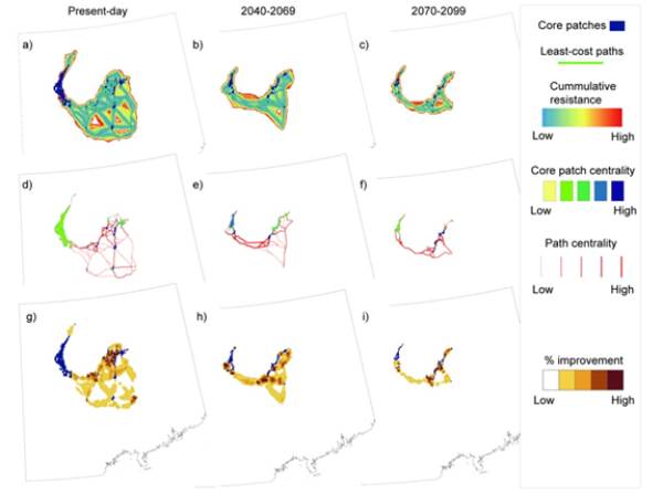 图3 气候变化背景下棘腹蛙适宜栖息地核心斑块间连通性的变化格局