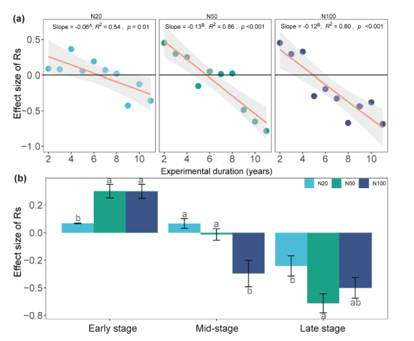 工业革命以来,化石燃料燃烧与农业化肥施用导致大气氮沉降增加,对生态系统碳循环产生深刻影响。土壤呼吸是土壤通向大气的最大碳通量,以往研究通常认为氮添加抑制森林土壤呼吸,但关于土壤呼吸如何响应长期氮添加以及氮添加水平如何调控其时间动态尚不明确。