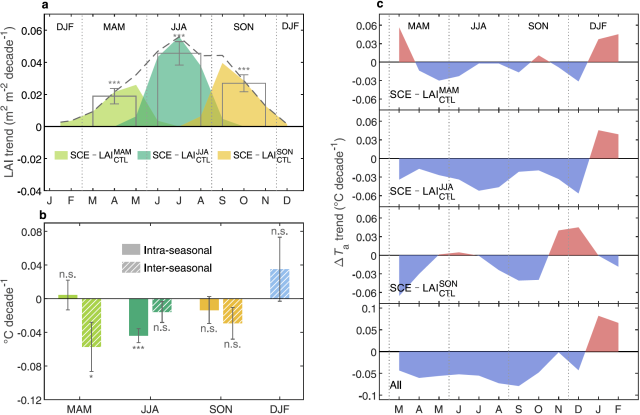 植被是地表多圈层物质和能量交换的重要媒介。全球变暖背景下,北半球中高纬度各季节植被活动均显著增强,反之又会通过生物物理和生物化学过程调节气候。然而,关于季节尺度植被活动的气候效应,早期研究注重以碳循环为主的生物化学过程,而通过改变地表能量收支产生的生物物理效应却鲜有关注。