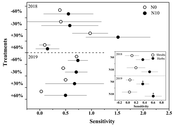 图1.灌木和草本生产力对降水变化和施氮的敏感性