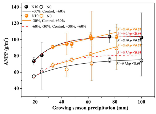 中国科学院新疆生态与地理研究所荒漠与绿洲生态国家重点实验室研究员杨维康/张元明团队基于准噶尔东部荒漠假木贼(Anabasis salsa)-绢蒿(Seriphidium borotalensis)群落水氮交互作用的野外模拟实验发现:施氮导致群落地上净初级生产量(ANPP)显著增加,但未改变ANPP对降水变化的敏感性,致使在大幅度极端降水范围,ANPP和降水量仍呈饱和的非线性模式,这表明在荒漠生态系统中,除土壤养分外,群落组成和植被自身限制可能是制约ANPP对降水变化敏感性的重要因子。该研究可为更准确预测未来降水变化和氮沉降增加背景条件荒漠生态系统碳循环动态提供科学依据。