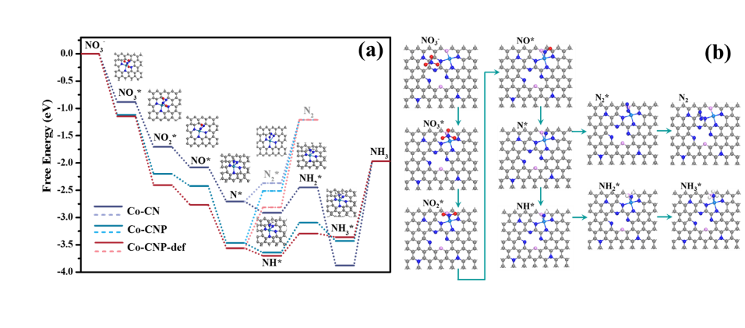 研究团队根据密度泛函理论计算,创新强化污染物净化的单原子尺度结构调控理论与方法,从分子水平上对硝酸根在模型单原子钴催化剂活性位点的转化反应机理进行了探究,分析反应路径和能量变化。结果表明,硝酸根在单原子位点上逐步发生脱氧加氢的基元反应,N*物种可以在外部提供能量时进一步偶联形成氮气,也可以自发与氢逐步反应形成铵盐。磷掺杂后形成的缺陷位点可以促进临近CoP1N3位点对硝酸盐的催化转化,硝酸盐还原过程发生8电子数转移生成铵盐。此外,研究还发现,金属活性位点临近的缺陷结构有助于进一步提高单原子催化剂活性,在理论上为设计高活性位点的催化剂提供指导并揭示硝酸反应转化和产物分布规律。