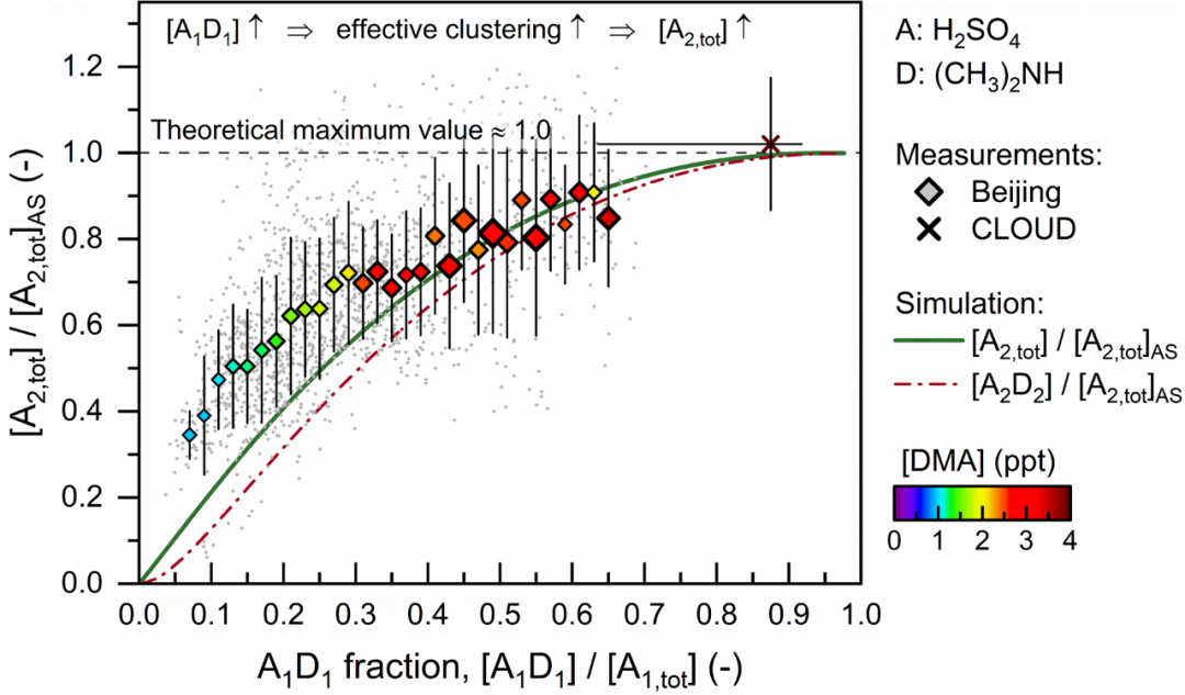 新机制表明,所测得的气态硫酸分子实际上有相当比例以酸碱双分子团簇形式存在,且气态硫酸将以酸碱双分子团簇形式参与更大团簇的生长过程。同时,有机胺浓度的上升可提高酸碱双分子团簇在气态硫酸中的占比,进而增加气态硫酸之间有效碰撞并生成更大团簇的概率,将团簇生成速率和新粒子生成速率推向理论最大值(图3)。