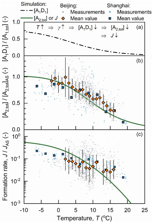 图4.温度对新粒子生成的影响。(a)酸碱双分子团簇比例;(b)含两个硫酸分子团簇浓度;(c)新粒子生成速率