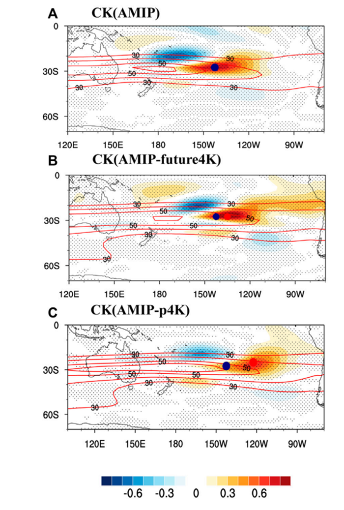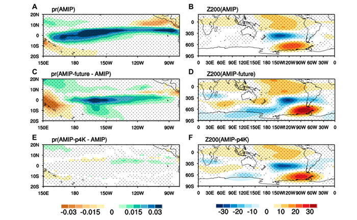 在全球变暖背景下,ENSO遥相关会如何变化?有研究提出,厄尔尼诺型海洋增暖背景下ENSO激发的热带太平洋降水异常东移,导致未来ENSO遥相关向东移动。除与热带降水异常有关之外,ENSO遥相关也受到热带外大气背景流场的影响。中国科学院大气物理研究所研究员黄刚团队前期工作发现,副热带急流的差异对遥相关的非对称性有重要贡献。基于这一思路,研究使用CFMIP中的系列AMIP实验发现,考虑厄尔尼诺增暖型的作用,AMIP-future4K实验可较好地复现出CMIP实验中南半球ENSO遥相关的东移。即使不考虑海洋增暖模态的作用,仅使用均匀增暖海温强迫(AMIP-p4K实验),遥相关仍会东移。