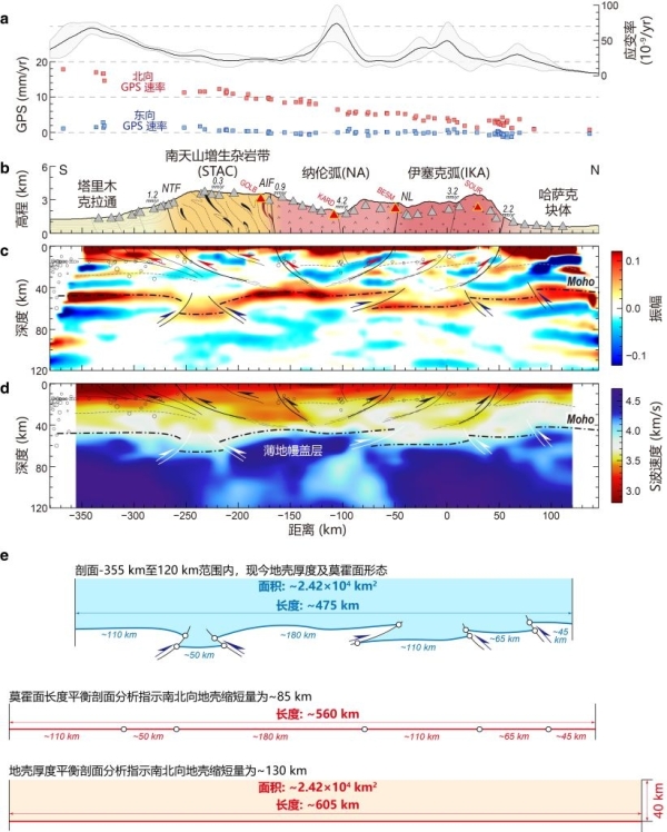 中国科学院地质与地球物理研究所岩石圈演化国家重点实验室壳幔结构探测学科组博士后李玮与合作导师/副研究员陈赟、中科院院士肖文交,以及德国地学研究中心研究员袁晓晖、英国莱斯特大学教授Brain F. Windley等合作,主要基于MANAS计划宽频带地震观测资料(图1),在有效解决不同资料联合反演过程中面临的信息来源同化、敏感度取舍、分辨率协同等关键技术问题的情况下,开展远震接收函数与面波频散联合反演和共转换点叠加成像研究,构建了横跨中天山典型剖面的地壳上地幔精细几何、速度结构,揭示了中天山垂向上浅部地壳逆冲推覆、深部莫霍面错断叠置、横向上由构造继承性主导的分布式变形特征;在厘清新、老构造关系的基础上,通过平衡剖面、变形速率分析等估算得到新生代天山地壳缩短仅为百公里级,其主要活化、隆升启动时间约为10Ma;结合这一变形的时间-空间特征,与印度板片向北楔入与塔里木克拉通发生作用的进程相吻合,从而指示印度-塔里木岩石圈地幔的直接碰撞是天山活化、隆升的根本动力来源(图3)。