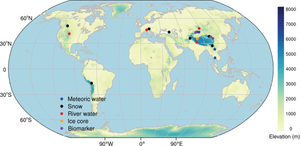 目前,不同地表介质中稳定同位素出现“反高程效应”的原因仍然不明。为此,中国科学院青藏高原研究所环境变化与多圈层过程团队余武生等联合美国俄亥俄州立大学教授Lonnie Thompson、澳大利亚詹姆斯·库克大学博士Stephen Lewis等,在全球尺度上,从大气水汽稳定同位素的新视角,系统地揭示了地表介质稳定同位素出现“反高程效应”的原因(图1),并对未来利用稳定同位素方法重建古高度的工作提出了重要建议。