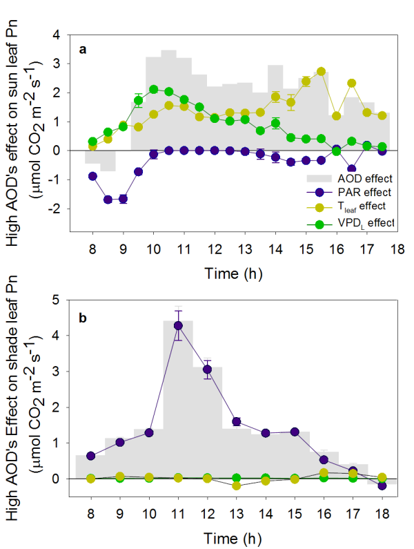 中国科学院植物研究所刘玲莉研究组以中国北方广布树种杨树为研究对象,利用北京地区气溶胶浓度周期性波动,开展了长期定位观测实验,以揭示气溶胶对阳生叶和阴生叶光合作用日动态的影响及其调控机理。该研究在生长季晴朗无云的天气下进行,分别观测不同气溶胶浓度下的阳生叶和阴生叶的光合作用日动态,同时监测气溶胶光学厚度以及叶片温度、叶片接收的光合有效辐射、叶片与大气间的饱和水汽压差(VPDL)等叶片微环境。结果表明,气溶胶同时促进阳生叶和阴生叶的光合作用,但对阳生叶光合作用的促进作用主要发生在正午和下午;而对阴生叶光合作用的促进则贯穿整个白天。结合光合作用机理模型,研究进一步发现,气溶胶对阳生叶光合的促进作用主要是通过缓解高温和高VPDL对光合速率的抑制来实现;对于阴生叶,提高光合作用主要是通过缓解冠层内部的弱光抑制来实现,且正午前后的效应最强。