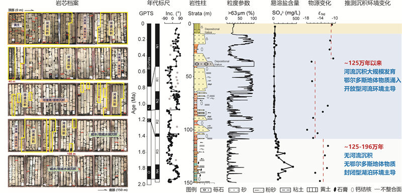 在陈发虎院士协调和布署下,兰州大学资源环境学院西部环境教育部重点实验室、黄河流域绿色发展研究院地貌演化与新生代环境研究团队王鑫教授、胡振波教授、聂军胜教授、潘保田教授等,与中国地震局地质研究所、中国地震局第一监测中心、日本岛根大学、中国地质大学(武汉)等单位联合,在三门峡盆地中心实施了环境钻探并开展合作研究,获取了黄河贯通三门峡历史完整的岩芯档案,通过与盆地边缘露头剖面的对比,明确了岩芯108 m处河道沉积物的首次出现是黄河在三门峡地区留下的最老印迹。