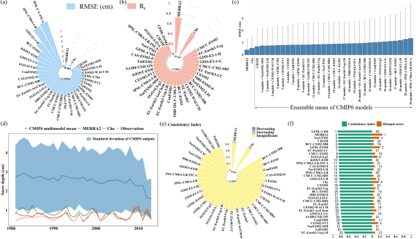 近期,中国科学院青藏高原研究所环境变化与多圈层过程团队综合使用长时间序列站点观测、再分析资料(MERRA2)和遥感雪深产品(Che)等多源数据,系统评价了31种CMIP6模式对中国雪深的模拟性能,并通过构建不同时期误差影响的误差回归模型,探究了雪深模拟的主要误差来源。此外,针对传统评价指标不足,该研究提出了可更有效评估模型模拟显著积雪变化趋势能力的新指标(命名为“热点分数”,Hotspot score)。