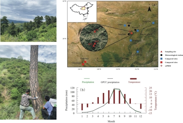 图1.研究区域采样环境概述。(a)研究区位置、采样点、气象站和对比点;(b)气象站和GPCC的区域月降水量和温度记录