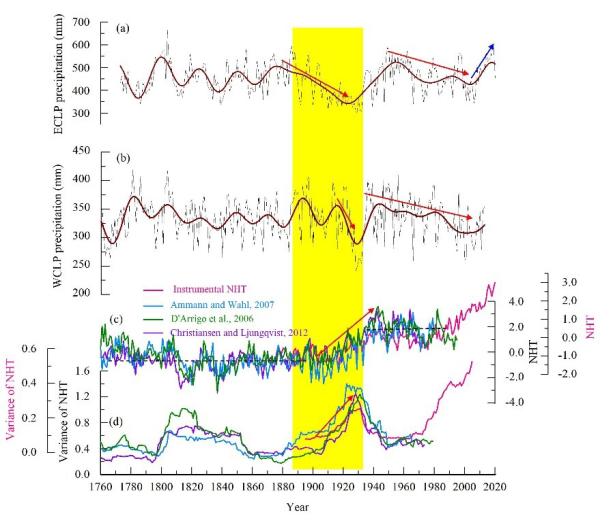 黄土高原位于中国北方中部,是中华文明的摇篮。干旱是黄土高原面临的最具影响的气候挑战之一。大量研究表明,20世纪下半叶以来,黄土高原及其周边地区干旱化趋势显著,由此引发了人们对于这一广大地区水资源短缺的担忧。在过去几个世纪的背景下,目前的降水状况如何?黄土高原内部降水存在怎样的时空差异?除已知的夏季风系统对黄土高原降水的影响外,其他因素是否对干旱事件的形成产生影响?