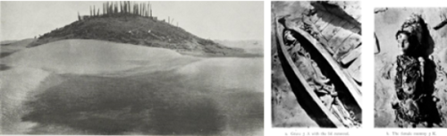 图1.小河墓地全景、船形棺、出土干尸(摘自《新疆考古研究》,1939年)
