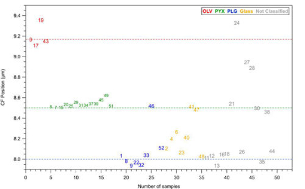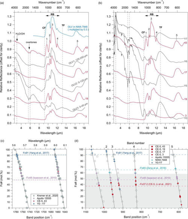 橄榄石是岩浆冷却过程中结晶最早的矿物之一,其晶体中Mg与Fe的相对含量(Fo,镁值)对于指示原始岩浆的成分具有重要意义。橄榄石RB特征中的几个反射峰的峰位会随着镁值的变化而发生系统的偏移。基于嫦娥五号橄榄石显微光谱中的RB峰位,研究人员反演得到了这些橄榄石的镁值,结果与先前报道的实验室测量结果相一致(图3d),表明该方法虽然是基于常规FTIR测量的红外光谱建立的,但是在显微红外光谱分析中也是可行的。