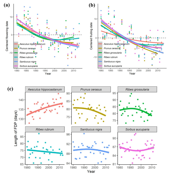 中国科学院华南植物园生态中心副研究员马倩倩与合作者,利用历史物候观测资料(1980-2013年),分析了6种常见温带木本植物的开花和结果物候期和果实发育期时长对气候变暖的响应。研究发现,所有物种的开花和结果时间均随气候变暖而提前。相应地,整个果实发育期表现为前移趋势。然而,同一物种开花和结果时间的提前速率并不一定相等,使得果实发育期时长随变暖呈现三种不同变化——延长、缩短或不变。这与植物生长季随变暖普遍延长的现象不同。果实发育期的差异化响应表明植物对于气候变暖采取了不同的繁殖物候响应策略,由此可能会改变物种适应性,进而影响森林生态系统结构和功能。