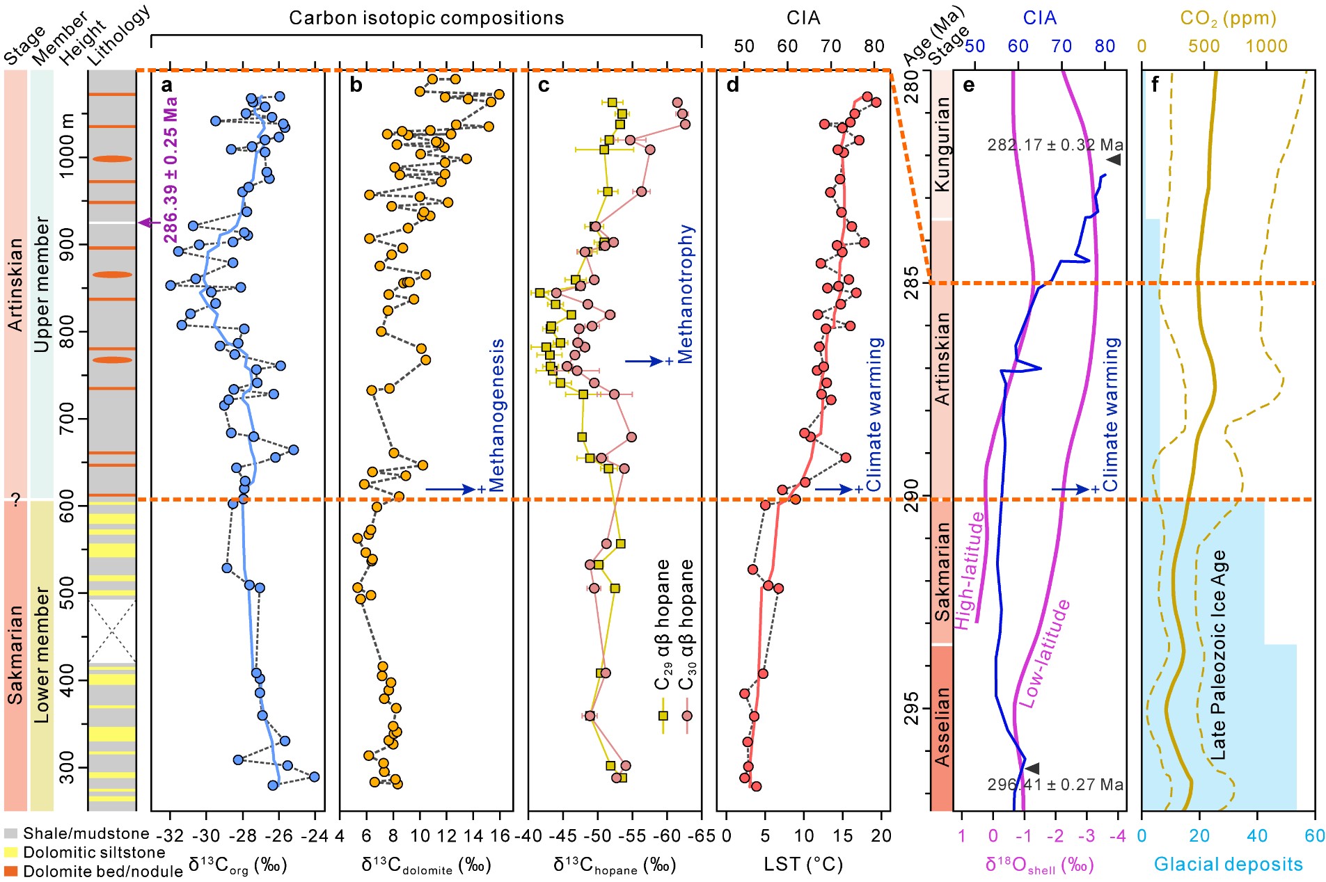南京大学地球科学与工程学院胡文瑄教授团队以我国西北地区新疆准噶尔盆地南缘的芦草沟组湖相沉积岩为研究对象,在前期工作基础上(Geology, 2021; 报道了产甲烷古菌微化石群),与沈树忠院士团队合作,开展了同位素年代学和有机-无机地球化学综合研究,揭示了早二叠世关键气候转折期发生了持续加剧的湖泊CH4动态循环,提出湖泊CH4排放是促进晚古生代大冰期结束和气候变暖的重要因素。